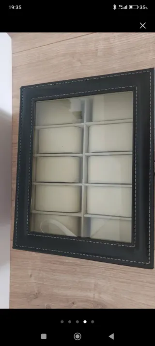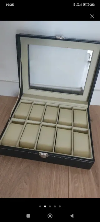 Elegante relojero con capacidad para 10 relojes. Ideal para organizar y proteger tu colección. - Exterior en color negro. - Interior con almohadillas en color beige. - Tapa con ventana de cristal. - Cierre de seguridad. Nuevo sin usar. Ideal para regalar esta navidad. Si tienes alguna duda, preguntame sin compromiso.