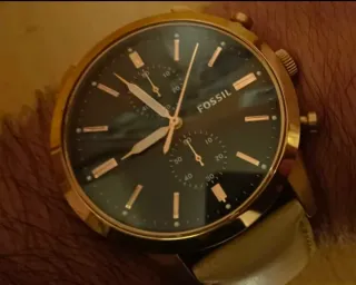 Elegante reloj Fossil con detalles en dorado y esfera negra. - Diseño moderno y sofisticado. - Correa de cuero clara.