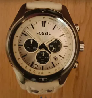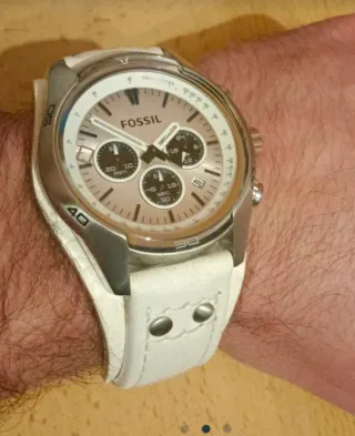 Elegante reloj Fossil con correa de cuero blanco y detalles plateados. Un accesorio versátil para el día a día. - Diseño de cronógrafo. - Correa de cuero. - Esfera plateada.