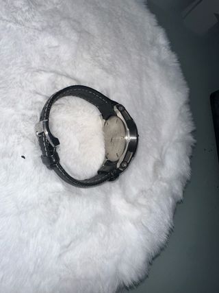 Reloj de pulsera con diseño moderno y detalles llamativos. - Esfera negra - Correa de cuero negra. - Bisel plateado. - Indicador de segundos en la esfera.