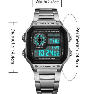 Reloj digital deportivo tipo con correa de acero inoxidable, un buen reloj, resistente, resistente al agua, batería infinita casi. La pnatalla digital del reloj proporciona una visualización clara y precisa de la hora y las funciones del reloj. Ideal para actividades al aire libre, acuáticas, deporte, gimnasio, trabajo, etc. NUEVO A ESTRENAR. Acero inoxidable, resistente al agua, cronógrafo, alarma, iluminación... - Material de la correa : Acero inoxidable - Longitud de la banda : 26,5cm - Grosor de la caja : 13,2mm - Resistente al agua hasta una presión de 5Bar Hago envíos en el día. 100% 5 estrellas vendedor de confianza :)