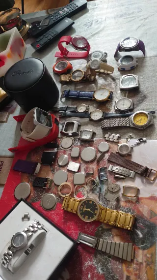 Lote variado de relojes y accesorios. - Relojes de diferentes estilos y marcas. - Componentes y correas de relojería. - Piezas de repuesto y esferas. Funcionan
