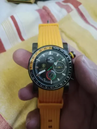 Reloj de pulsera con correa de silicona. - Esfera negra con detalles en verde y rojo. - Bisel con indicador de 24 horas y Second Time Zone. - Correa de silicona amarilla.