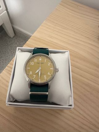 Reloj de pulsera con esfera amarilla y correa de tela verde. - Diseño tipo piloto. - Correa de nailon con pasadores metálicos. Nuevo sin estrenar.