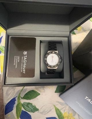 Reloj TAG Heuer con caja y correa en tonos negros y plateados. Incluye - Esfera blanca. - Bisel con marcadores. - Correa de eslabones. En muy buen estado cok su caja original bonito pero quiero comprarme otro