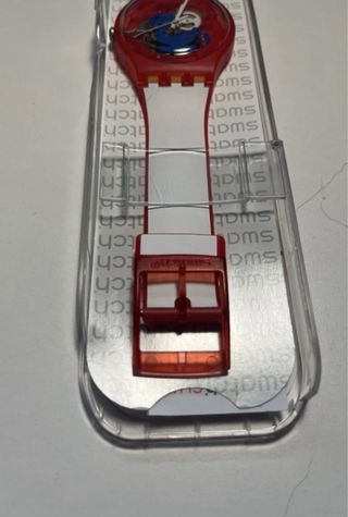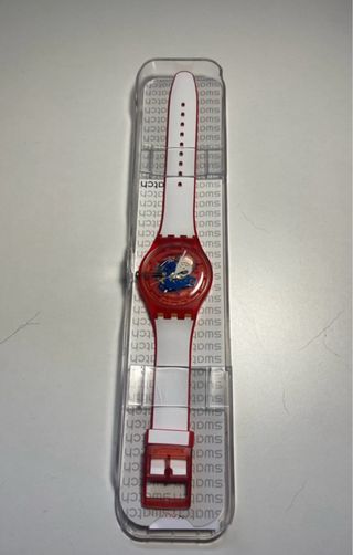 Reloj Swatch con diseño llamativo. - Correa blanca. - Caja y detalles en rojo. - Esfera con diseño de pez payaso.