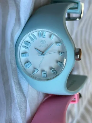 Relojes de la marca Marea con un diseño moderno y llamativo. - Correa de silicona en color rosa. - Esfera blanca con números.