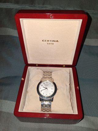 Elegante reloj de pulsera Certina con una esfera blanca y detalles plateados. - Caja y brazalete de acero inoxidable. - Diseño clásico y atemporal.