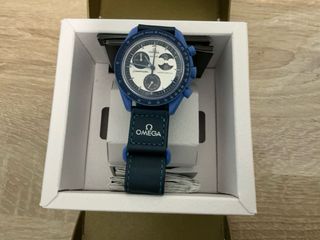 Reloj Omega Swatch con caja y correa en tonos azules y esfera blanca. - Diseño moderno y llamativo. - Correa con detalles de costura en contraste. - Cierre de velcro ajustable. Nuevos a estrenar 50 por cada uno