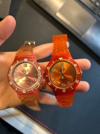 Conjunto de dos relojes G&B con un estilo vibrante, perfecto para el verano. - Diseño transparente en tonos naranja y rosa. - Estilo inspirado en la moda Y2K. ⏱ Funcionan PERFECTOS 💧 Water resist 30M 🇯🇵 Movimiento japonés ✨ Ligeros, cómodos y súper vistosos ⚠️ Reloj rosa: arreglar correa