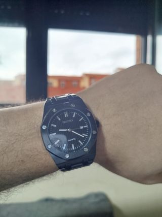 Reloj Seiko Mod estilo Royal Oak en negro total, con acabados premium y una presencia brutal en muñeca. ⭐ Características principales ⌚ Caja y correa de acero inoxidable galvanizado negro (no pierde color) 📏 42 mm – tamaño perfecto y elegante 🖤 Dial negro Seiko con fecha a las 3 🔍 Cristal Hardlex resistente a golpes ⚙️ Movimiento de cuarzo sl28 con pila nueva con duracion de mas de 2 años 💧 Resistencia al agua 30 m 🔒 Cierre de mariposa cómodo y seguro 🆕 Totalmente nuevo 🎁 Incluye Caja de regalo Herramienta de ajuste Ajuste GRATIS si nos dices tu talla en cm antes del envío 💰 Precio: solo 30 € 🔥 Increíble
