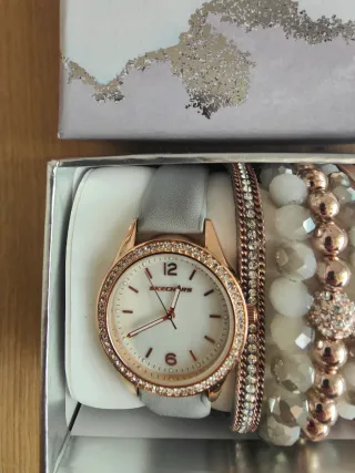 Precioso conjunto de reloj y pulseras de Skechers. - Diseño elegante en tonos dorados y grises. - El reloj tiene una correa gris y detalles en oro. - Las pulseras son variadas, con cuentas y adornos.