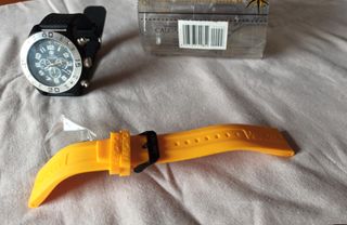 Reloj de pulsera para hombre con dos correas intercambiables. - Correa principal de color negro. - Correa adicional de color amarillo. - Esfera con detalles plateados.