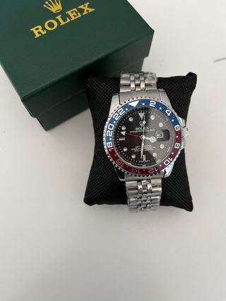 ⭐️Reloj de pulsera con un diseño distintivo y elegante. - Bisel giratorio con detalles en rojo y azul. - Esfera negra con marcadores plateados. - Correa de eslabones plateada. -Para ponerlo a funcionar hay que romper el seguro que tiene en la corona -Para ajustar el fechador hay que tirar de la corona hasta el fondo Envíos en 24-48 horas días laborables 🚚🚀