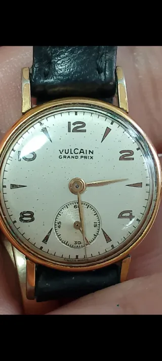 Elegante reloj Vulcain Grand Prix de los años 40. Un clásico con un diseño atemporal. - Caja en tono dorado. - Esfera blanca con detalles en dorado. - Correa de piel negra.