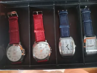 Conjunto de cuatro relojes con correas de cuero. Nuevos a estrenar. Dos relojes con correa roja y dos relojes con correa azul.