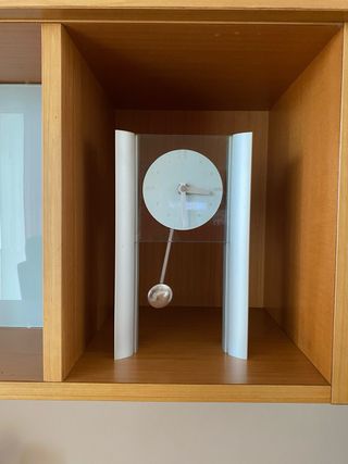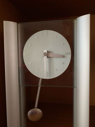 Elegante reloj de péndulo con un diseño moderno. - Esfera redonda. - Péndulo con bola plateada. - Marco de cristal y soportes plateados
