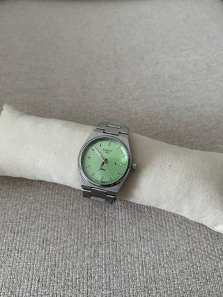 Elegante reloj Tissot PRX con una llamativa esfera verde y detalles plateados. - Diseño moderno y deportivo. - Brazalete de acero inoxidable.