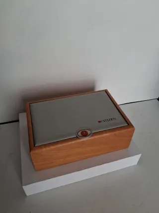 Elegante caja de madera para guardar relojes. - Acabado en madera clara. - Tapa con detalle gris y logo de Citizen. - Cierre con detalle circular.