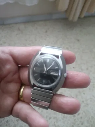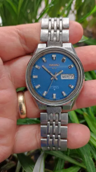 Reloj Seiko 5 con movimiento automático y esfera de color azul. - Caja y brazalete de acero inoxidable. - Ventana de día y fecha funcionando perfectamente - 21 joyas. - Movimiento funcionando perfectamente - 38 MM - Con algunos signos de desgaste en la esfera 👉🏻 NO TIENE EL 5 EN LA PARTE DE ARRIBA