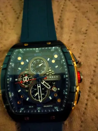 Elegante reloj con diseño deportivo y detalles en dorado. Perfecto para el día a día. - Correa de silicona azul. - Esfera con múltiples subesferas. - Bisel con detalles dorados.