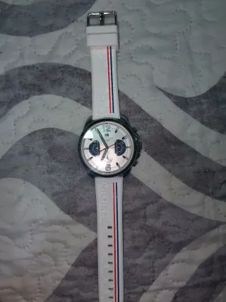 Reloj de pulsera con correa de silicona blanca y detalles de rayas rojas y azules. - Esfera con múltiples indicadores. - Cierre de hebilla plateada. - Correa con el nombre de la marca grabado.