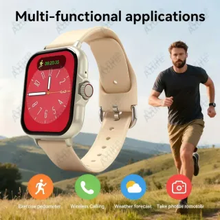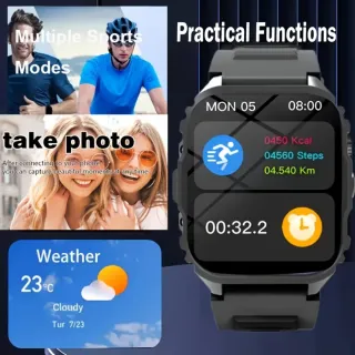 Reloj inteligente con múltiples funciones. - Múltiples modos deportivos. - Función para tomar fotos conectando al teléfono. - Información del tiempo. - Seguimiento de actividad física (calorías, pasos, distancia).