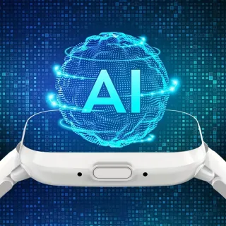 Reloj inteligente con diseño moderno y tecnología AI. - Esfera con diseño de red y texto AI. - Correa de color blanco. - Detalles en azul brillante.
