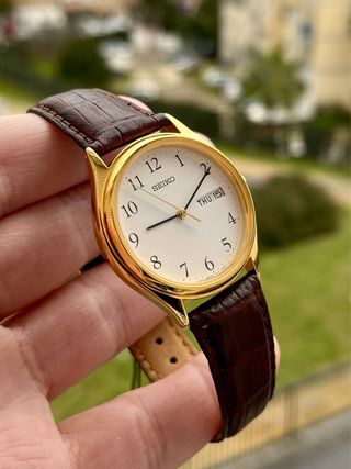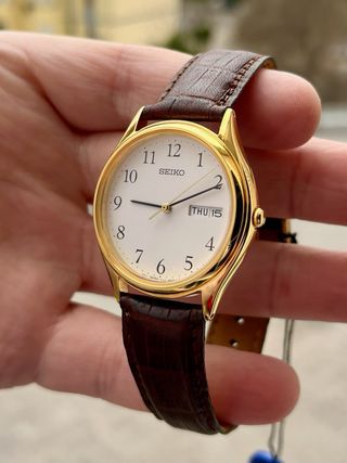 ¡Se entrega en estuche genérico de transporte y con su certificado de garantía (no está sellado, porque no llegó a venderse) que le acompañaba en su momento! -Marca®️: Seiko 🇯🇵 -Referencia: 7N43-8A90 A4 (SGG478P1) -Nº de serie: 522612 -Estado✅: en estado NOS (New Old Stock) y funcionando perfectamente (pila recién cambiada). -Tamaño aprox.📏: 34,5mm sin contar la corona. -Color esfera🕢: blanco con marcadores en números arábigos y segundero en tono dorado. -Movimiento: Quartz. -Fechador: inglés/italiano. -Año de fabricación aprox.📆: 1995. -Material correa🎗️: piel original de Seiko en color marrón y con hebilla firmada.