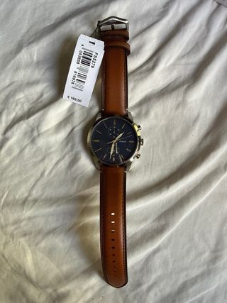 Elegante reloj de pulsera con correa de cuero. - Esfera de color azul. - Correa de cuero marrón.