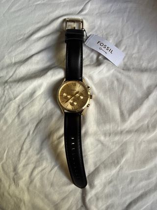 Elegante reloj de pulsera con detalles dorados y correa negra. - Esfera redonda. - Correa de cuero. - Diseño clásico.