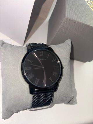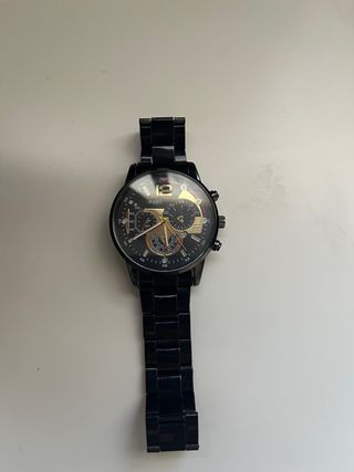 Elegante reloj de pulsera con un diseño moderno. - Esfera negra con detalles dorados. - Correa metálica negra.
