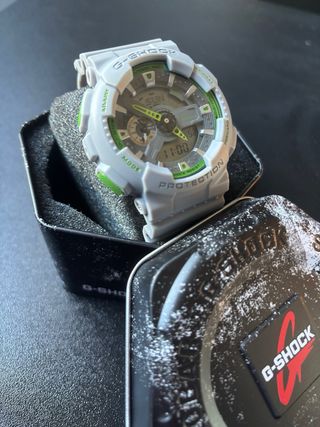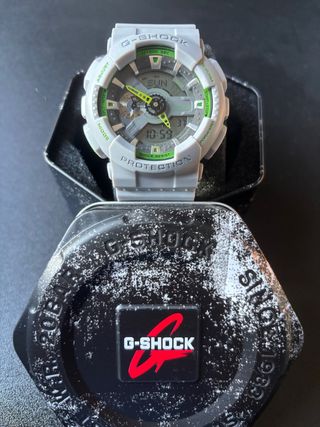 Reloj G-Shock modelo GA110 con un diseño llamativo. - Correa de resina gris. - Detalles en color verde. - Esfera analógica y digital. - Hora mundial (WT). - Cronómetro. - Cuenta atrás. - Alarma diaria (hasta 3 distintas). - Función luz automática.