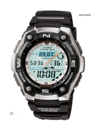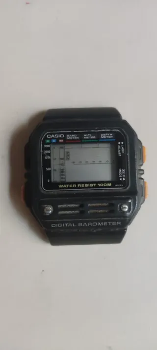 Reloj Casio 100-WJ, ideal para piezas o reparación. Presenta un diseño robusto con detalles en naranja. - Modelo: 100-WJ - Color: Negro y naranja - Resistencia al agua: 100M