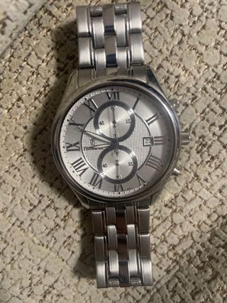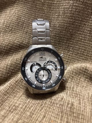 Elegante reloj Lotus para hombre, con un diseño deportivo y funcional. Se encuentra en muy buen estado. - Esfera plateada con detalles en negro. - Correa de metal. - Función cronógrafo.