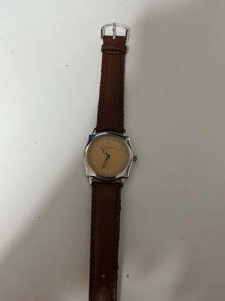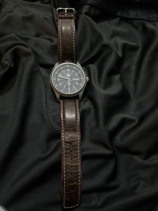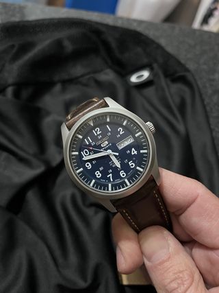 SE ADELANTA 1 hora/dia más o menos. Muy muy cuidado,prácticamente nuevo, sin arañazos y puesto muy poco, pero se adelanta y no me voy a marear en arreglarlo. *Correa original azul SIN ESTRENAR Reloj Seiko 5 Sports Military con correa de cuero marrón y detalles plateados. - Esfera oscura con números claros. - Correa de cuero con pespuntes. - Cierre de hebilla metálica.