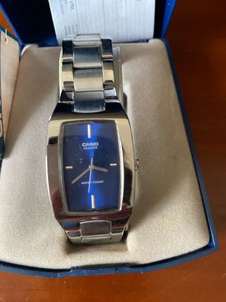 Reloj Casio con diseño moderno y elegante. - Esfera de color azul intenso. - Correa de eslabones plateados. - Resistente al agua.