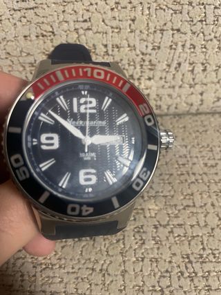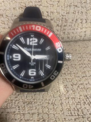 Reloj de pulsera de la marca Neckmarine con un diseño deportivo y moderno. - Bisel giratorio con detalles en rojo. - Correa de caucho negra. - Esfera oscura con marcadores plateados.