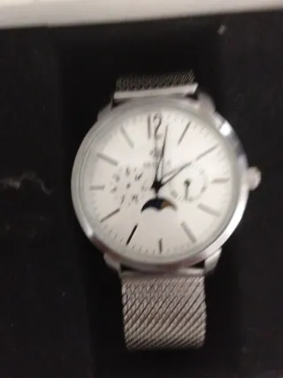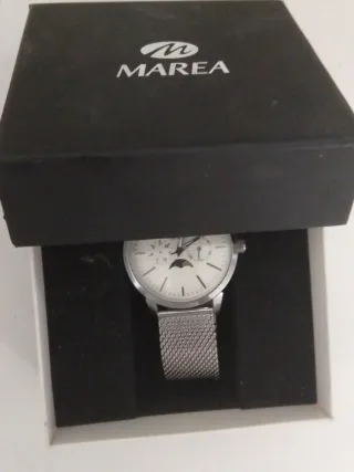 Elegante reloj Marea con un diseño moderno y sofisticado. - Esfera blanca con detalles plateados. - Correa de malla plateada. - Indicador de fase lunar.