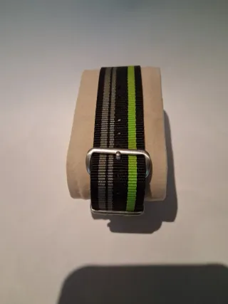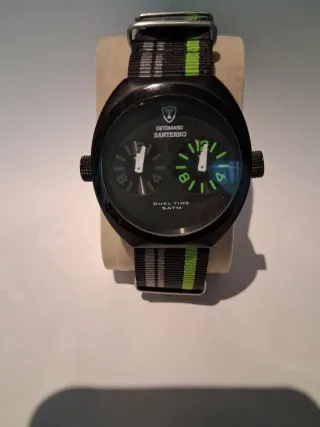 Reloj Detomaso Santerno con doble hora. - Correa de tela con rayas grises, negras y verdes. - Esfera negra con dos indicadores de hora. - Resistente al agua 5 ATM.
