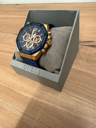 Elegante reloj de la marca Guess con un diseño moderno y llamativo. - Esfera azul con detalles dorados. - Correa de goma azul. - Bisel octogonal dorado.