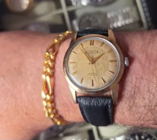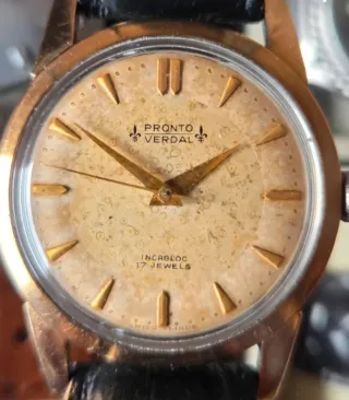 Reloj de pulsera Pronto Verdal con esfera dorada y detalles que le dan un aspecto vintage, caja de acero inoxidable chapada en oro 18k. Mecánico, caja de 34mm, pulsera de 18mm, esfera de pátina única que le da una belleza espectacular al reloj, cristal sin marcas, reloj en general con muy buen estado de conservación y funcionamiento. - Esfera con marcadores dorados. - Indicación de Incabloc 17 Jewels. - Correa de cuero negra. - Fabricado en Suiza.