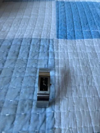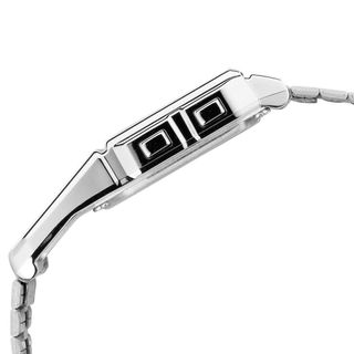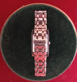 Elegante reloj de pulsera para mujer de la marca Lotus. Su diseño combina tonos plateados con una esfera negra. - Correa de eslabones plateada. - Caja rectangular plateada. - Esfera negra con detalles plateados. - Las fotos forman parte de la descripción. - Hace tiempo que está parado, seguramente funcione correctamente al ponerle la pila.