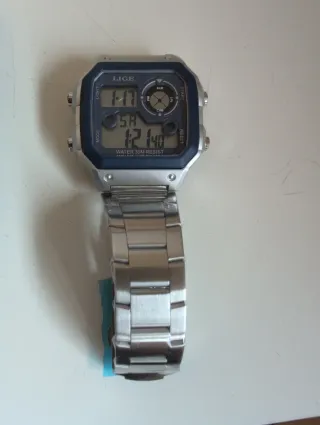 Reloj digital de la marca Lige con un diseño moderno y deportivo. - Esfera con detalles en azul. - Correa de metal plateada.