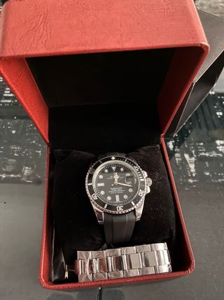 Elegante reloj Rolex con caja negra y detalles plateados. Incluye dos correas intercambiables para adaptarse a tu estilo. - Correa de caucho negra. - Correa de eslabones plateada.