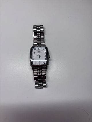 Elegante reloj Viceroy con un diseño clásico y sofisticado. - Caja rectangular plateada. - Esfera blanca con números y manecillas plateadas. - Correa de eslabones plateada. -Tiene iniciales grabadas, pero no son muy apreciables.