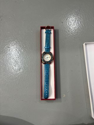 Elegante reloj de la marca Venice con un diseño llamativo. - Correa de piel azul con textura. - Caja dorada. - Cierre de hebilla.