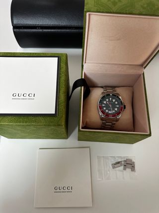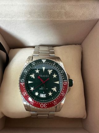 Reloj Gucci Dive de 45 mm con movimiento de cuarzo. Caja de acero, bisel giratorio verde y rojo con los colores clásicos de la marca, y esfera verde con marcadores que representan varios símbolos icónicos. Brazalete de acero. Cristal de zafiro. Resistente al agua hasta 200 metros. Referencia: YA136222 La COLECCIÓN DIVE está inspirada en los relojes de buceo, el diseño del Gucci Dive presume de un estilo contemporáneo. Con caja original y documentos.
