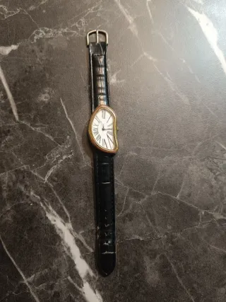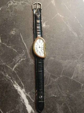 Reloj vintage de diseño "derretido" (Softwatch), homenaje directo a la obra de Salvador Dalí. Pieza muy difícil de ver, marcada como edición especial. Colección: En la tapa trasera indica "RARE SERIES 086". Correa original grabada con "Ars Folie". Estética: Caja asimétrica dorada y esfera con números romanos distorsionados. Reloj con mucha personalidad y marcas de su historia. El dorado de la caja tiene desgaste (ver fotos) y la correa de cuero original muestra grietas por el tiempo pero conserva su firma original. Funciona y es una joya para coleccionistas de relojes raros y amantes del arte. 📦 Envío rápido y protegido.