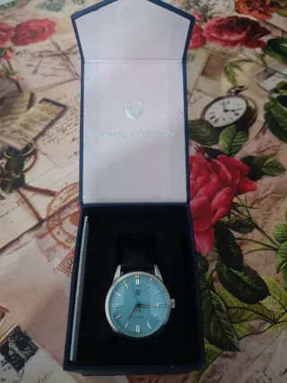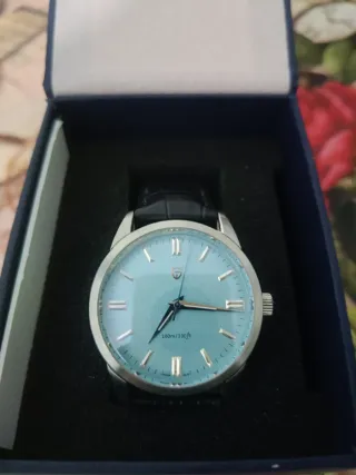 Elegante reloj de pulsera con una esfera de color azul claro y detalles plateados. La correa es de cuero negro. - Esfera de color azul claro. - Correa de cuero negro. - Bisel plateado.